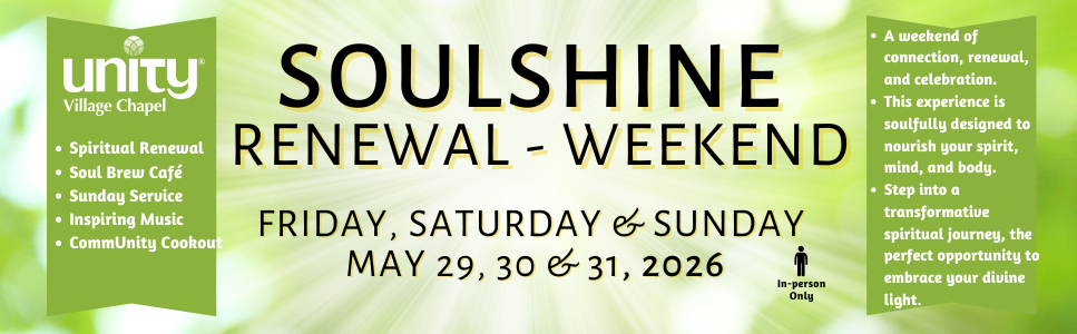 You’re warmly invited to Unity Village for a SoulShine weekend of connection, renewal, and celebration. Hosted by Rev. Erin and your Unity Village Chapel staff, this Homecoming experience is designed to nourish your spirit, mind, and body. Whether you’re reconnecting with old friends or stepping into a transformative spiritual journey, this weekend offers the perfect opportunity to embrace your divine light.